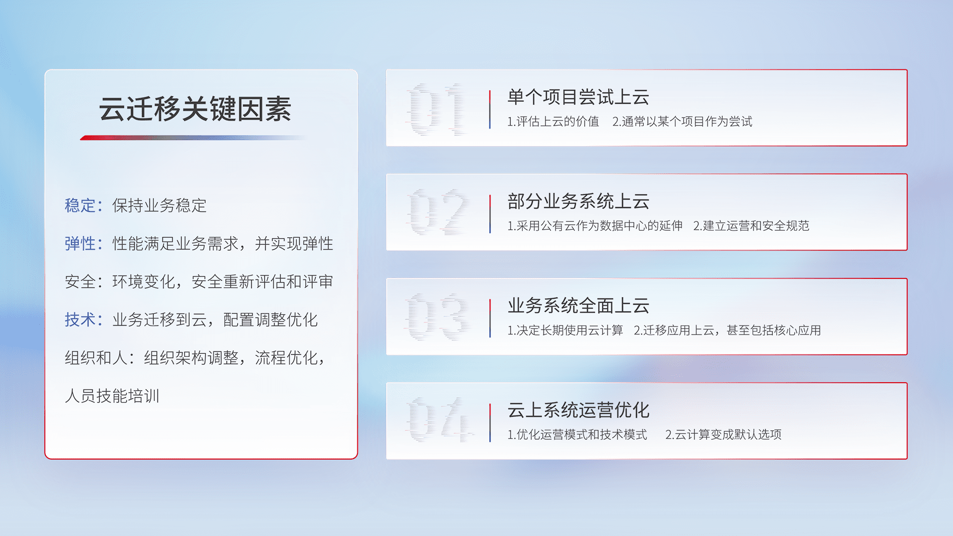 结合实际业务,,,从规划设计、、、、云平台选型、、云原生改造、、数据迁移、、、、集成交付,,,,迁移全过程为客户识别最佳上云路径,,,做好风险识别管理,,设计网络架构、、身份权限、、、安全审计合规、、、操作审计、、、日志审计、、监控告警策略、、、多站点容灾设计等,,,,对云上基础设施进行整体规划,,,提升IT治理水平,,,以满足弹性、、高可用、、、、高性能的需求。。。。