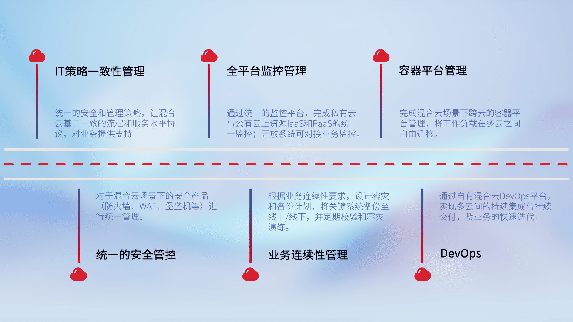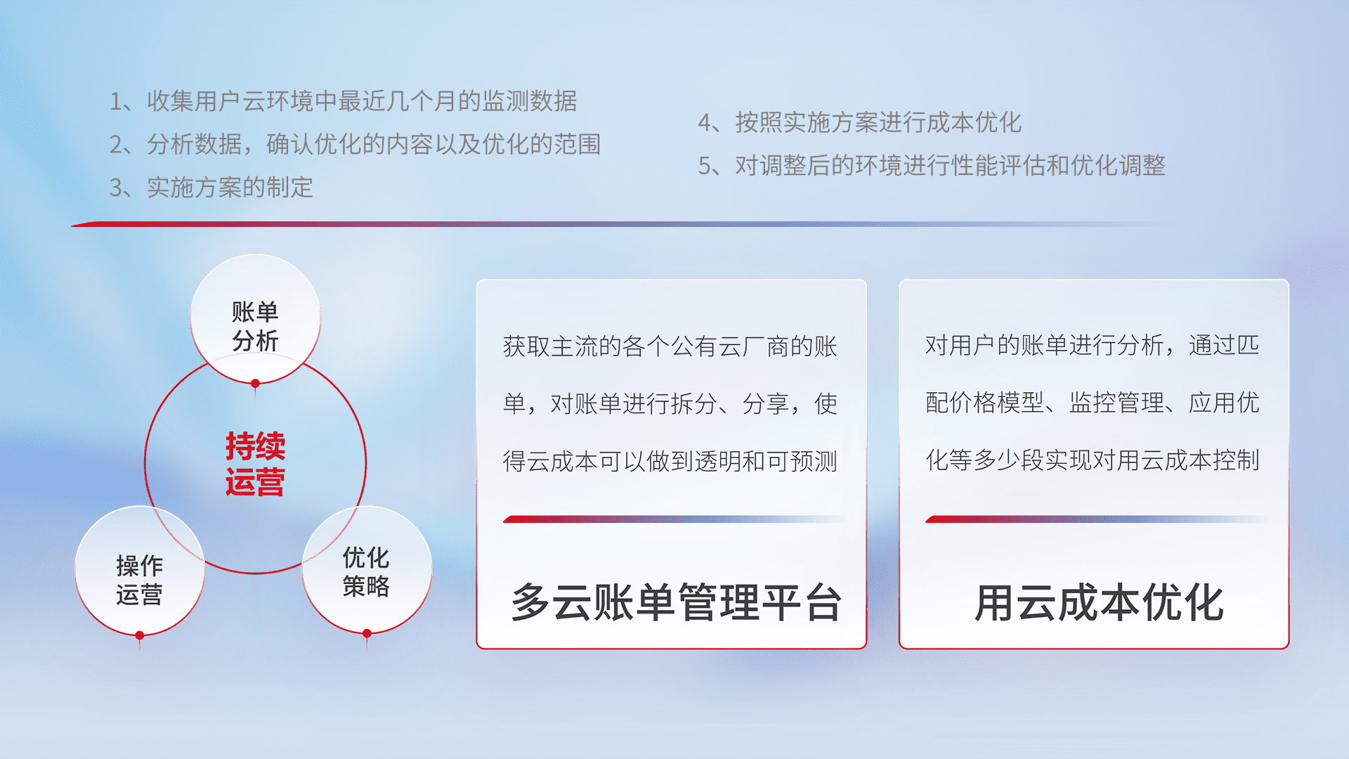 通过多云纳管,,,,以统一的资源数据模型把客户的云资源进行抽象和封装,,,进而实现对多云资源的统一操作,,,,保障云资源管理的可靠性、、、稳定性与可用性。。。量身定制化运维内容,,,,配置、、、、开发运维、、、补丁管理、、、、备份、、、监控、、、认证和访问管理、、审计和日常巡检等,,,,保障在用云过程中的可靠度,,稳定度以及高可用率。。。