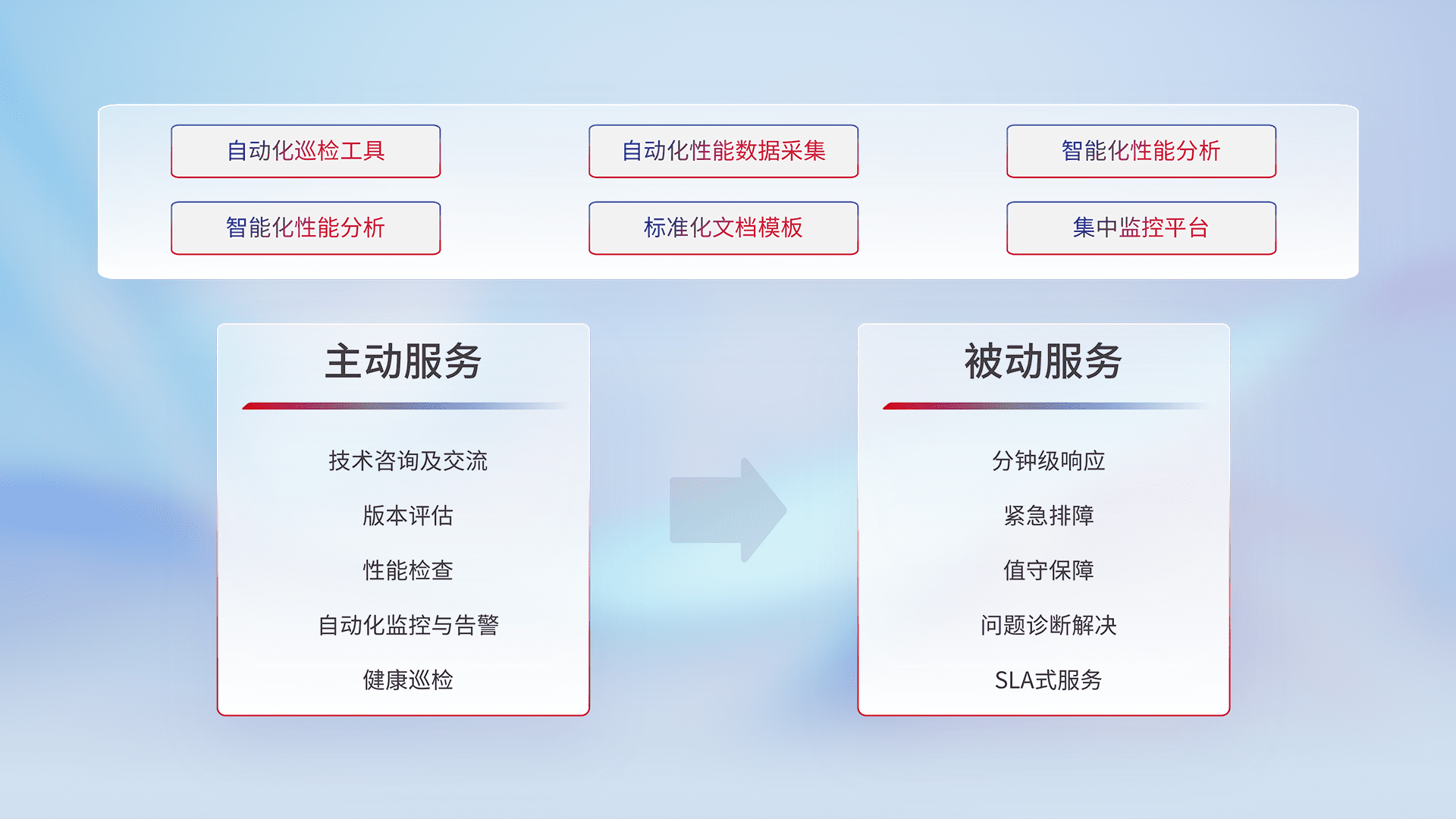 智能化工具和标准化文档,,,,保障服务质量,,,,提供主动服务(包含技术咨询、、、版本评估、、、性能检查、、、、自动化监控与告警、、、、健康巡检)和被动服务包含(分钟级响应、、紧急排障、、值守保障、、、、问题诊断解决、、、SLA服务)。。。